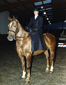 Das Abenteuer begann für mich bereits beim Abflug. Beruflich bedingt konnte ich mich nicht wirklich auf den Urlaub vorbereiten. Ich wußte, daß ich nach England wollte um im Damensattel zu reiten, aber sonst überließ ich mich meinem Schicksal. Nachdem ich Roger Philpott bei meiner Ausstellung am Gschwendthof kennen gelernt hatte, und er mich eingeladen hatte, beschloß ich in meine heißgeliebte zweite Heimat zu reisen. Nach mehreren Mails mit Roger wurde ich am Flughafen abgeholt. Im Auto erfuhr ich, daß bereits zwei weitere Damen bei Roger wohnten. Kate Ettrich aus Belgien und Rhonda Watts aus Amerika. Beide Damen wollten an der großen Show teilnehmen. Da Rhonda und Kate schon länger in England waren hatte ich einen sehr guten Einstieg, da beide mir den Tagesablauf erleichterten. In den ersten Tagen habe ich einige Pferde ausprobiert um dann schlußendlich bei "Harry " zu landen, dem Vollprofi in Springen und Dressur. So war das Leben dem Reiten im Damensattel gewidmet. Vormittag reiten, über Mittag darüber diskutieren und am Nachmittag lesen und bearbeiten der Fachbücher. An manchen Tagen machten wir einen Ausflug, wo wir uns natürlich auch mit diesem Thema befaßten. Wir fuhren über zwei Stunden in einen Ort, wo es mehr als 20 Buchgeschäfte gab. Unsere Ausbeute war leider mager, da wir kein Damensattelbuch bekommen haben, aber trotzdem sind wir nicht mit leeren Händen nach Hause gekommen.