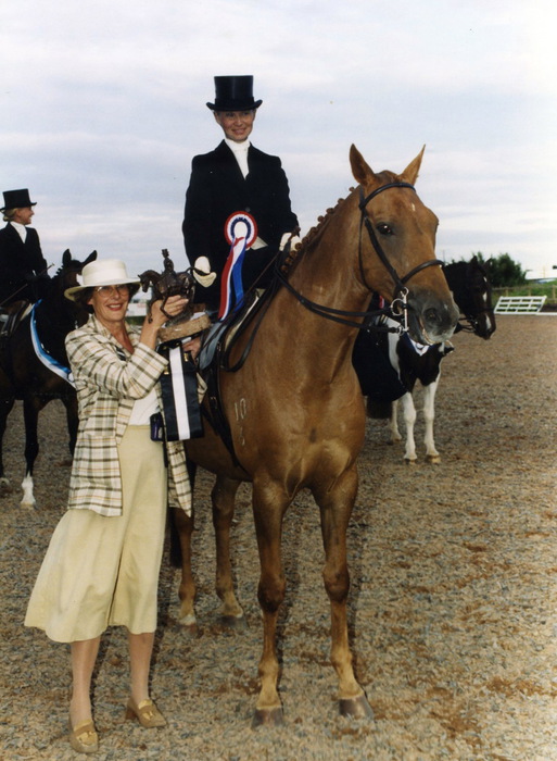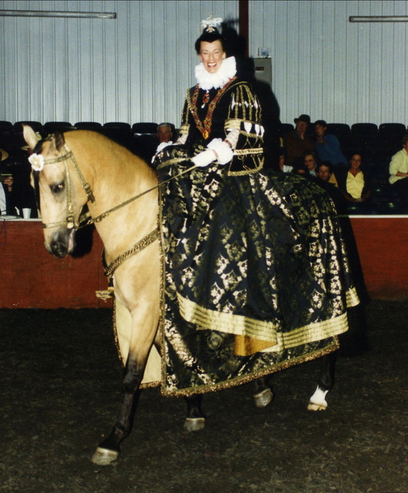 Donnerstag wurde alles zusammen gepackt, die Pferde gebadet, gezöpfelt, frisiert, rasiert, weiße Stellen nachgefärbt (gebleicht) und verladen. Am späteren Nachmittag setzte sich der Troß in Gang. Ich fuhr mit Roger in einem 27 Jahren alten Jeep, bei dem die Fensterscheiben etwas locker waren. So saß ich am Beifahrersitz und hielt eine Zeitlang diese Scheibe, bis Roger sie auf abenteuerlicheweise wieder montierte. Auf der Fahrt von mehr als 2 Stunden passierten wir einige Bodenschwellen. Roger fragte zwischendurch, ob der Wohnwagen eh noch hinten dran wäre. Abenteuer pur! Endlich angekommen war es sehr regnerisch und kalt. Rhonda und ich schauten, ob unser Wohnwagen dicht war. Er war es, im Gegensatz zu dem von Clarissa! Typisch englisches Wetter, aber trotzallem waren alle fröhlich, aufgeregt, die Pferde sauber, sogar die Schimmel glänzten weiß! Wie machen die das nur? Meine große Hoffnung erfüllte sich, als ich den Stand eines englischen Büchhändlers entdeckte! Ich konnte meine, schon relativ große Sammlung, um einige rare Exemplare erweitern! Am Turnier konnte ich die Bekanntschaft von Betty Skelton, einer 93 jährigen Dame, machen. Die Grande Dame des Damensattelreitens! Nicht nur daß sie einige Bücher über dieses Thema geschrieben hatte, zeigte sie mir auch, wie man korrekt im Damensattel sitzt. Ich verbrachte einen ganzen Vormittag bei ihr und lernte viel über Sitz, Reitstil und Korrigieren dieser Bereiche von ihr.